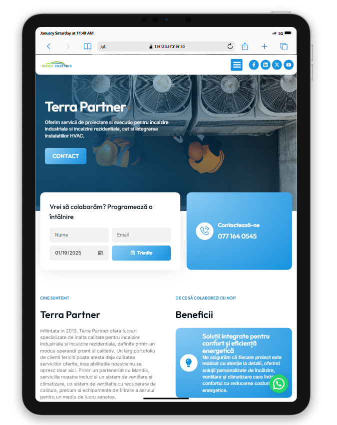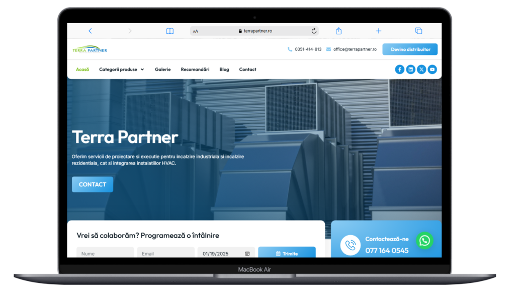 Rezultatul final Terra Partner dispune acum de un site profesional, optimizat pentru performanță și susținut de o strategie digitală cuprinzătoare. Design-ul modern, funcționalitățile integrate și campaniile de promovare bine direcționate asigură companiei o poziție solidă pe piață, devenind un punct de referință pentru soluții de încălzire și climatizare.