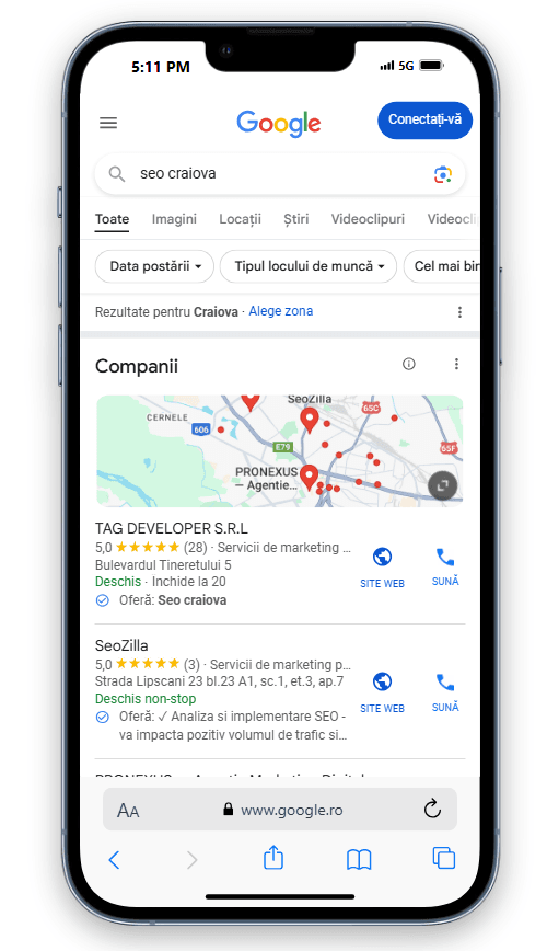 Poziționarea SEO locală este esențială pentru afacerile care vor să atragă clienți din zona lor. Optimizarea SEO locală te ajută să apari în căutările relevante din orașul sau regiunea ta, creând o vizibilitate mai mare în fața celor care caută produse sau servicii pe plan local. Cu o strategie bine gândită, afacerea ta poate apărea în topul rezultatelor pe Google Maps și în căutările locale, ceea ce duce la mai multe vizite, apeluri telefonice și conversii. Investind în SEO local, îți crești șansele de a fi găsit rapid de potențialii clienți din apropiere.